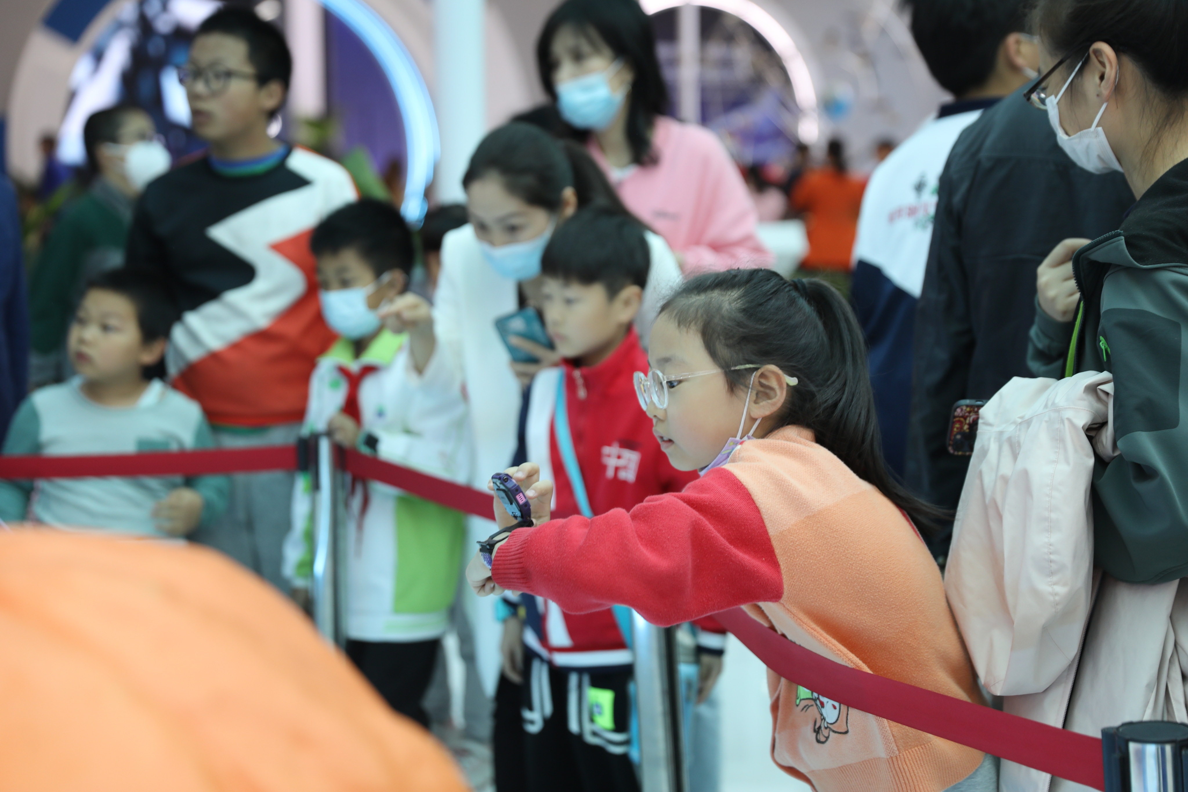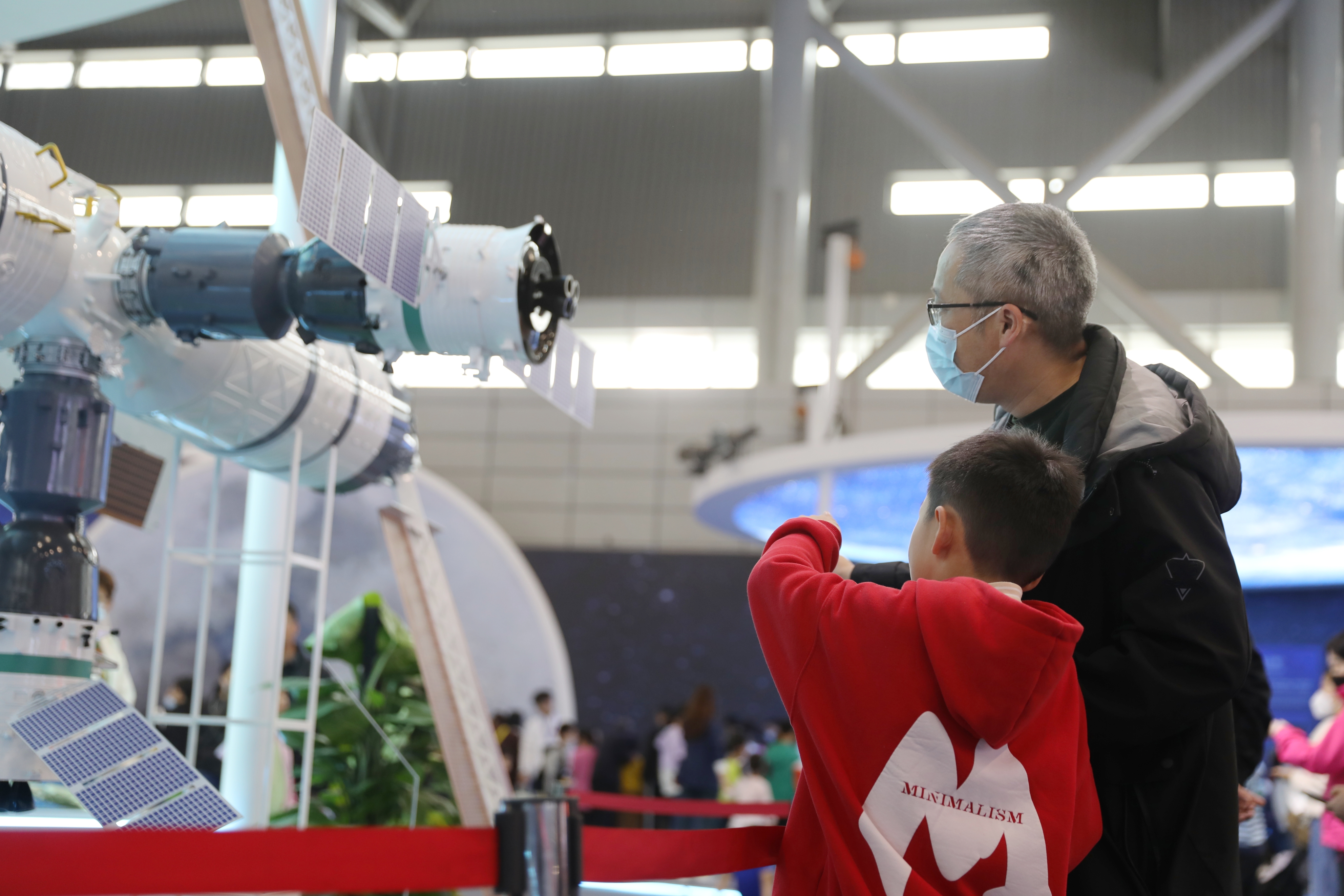 得知要来看航天展,小家伙兴奋地不得了。“我什么都想看,想都体验一遍。”