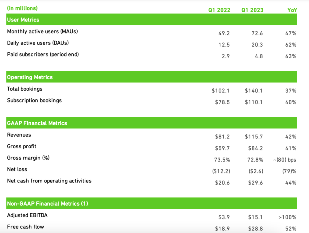 财报显示,Duolingo2023年Q1营收为1.2亿美元,同比增长42%;2023年Q1净亏损为260万美元,调整后季度 EBITDA (税息折旧及摊销前利润)为1510万美元。