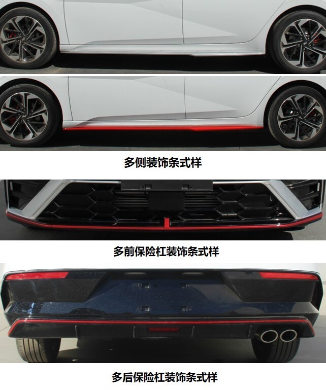 此次申报的车型整车采用了白色涂装,整体设计充满攻击性,黑化的车头以及全新设计的X型的前包围让它具有很强运动感。外观在多处有黑化处理,例如身LOGO、可选双色车身、黑色外后视镜,车尾后备厢盖上方的小型扰流板,和包括全新样式的后包围,融入了通风孔、扩散器以及单边双出排气口。
