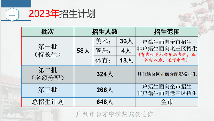 育才2023年总招生计划648人,其中,第一批次特长生招生58人(美术36人,管乐4人,体育18人),第二批次名额分配批招生324人,第三批招生266人。