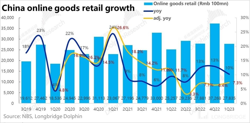 而本季度,国内零售客户管理收入(CMR)增速是-5%,收入为 603 亿元,低于市场预期的 614 亿。而随着疫情的影响在一季度逐渐消散,经统计局重述后的线上实物增速是环比提速到 7.3% 的。无论从预期差,还是相比大盘来看,淘、天平台的增长很难让人满意。