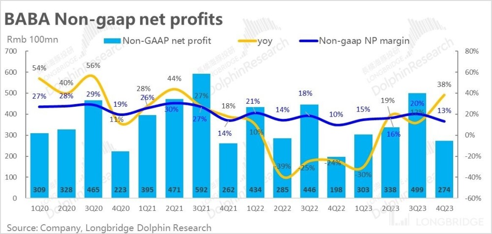 而调整后净利润更是达到 274 亿,同比增长超 38%,也显著高于市场预期的约 250 亿。
