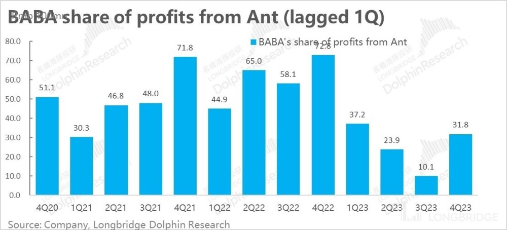 本季度,阿里来自于蚂蚁的权益法收益为 31.8 亿人民币,虽然同比降幅仍高达 56%,但绝对规模已恢复到本财年一季度的水平。海豚君认为,去年年底市场就已有传闻对蚂蚁集团的监管已进入常态化阶段。虽然目前蚂蚁何时能拿到金控牌照,甚至能否再度上市还尚未有任何消息。但从当前的趋势来看,在常规监管下,蚂蚁业绩的修复可能也在路上。