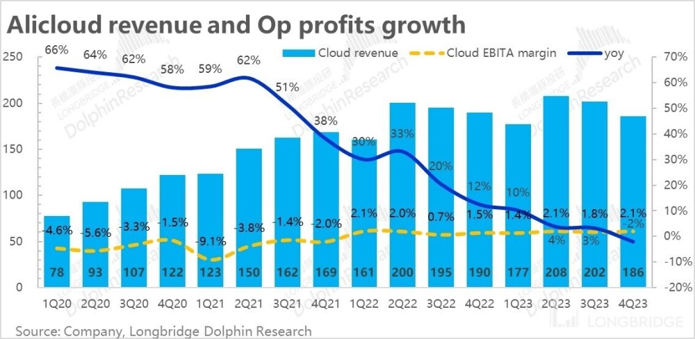 但从利润角度,虽然营收在下降,由于利润率在持续提升,阿里云的 EBITA 同环比来看,都在增长。