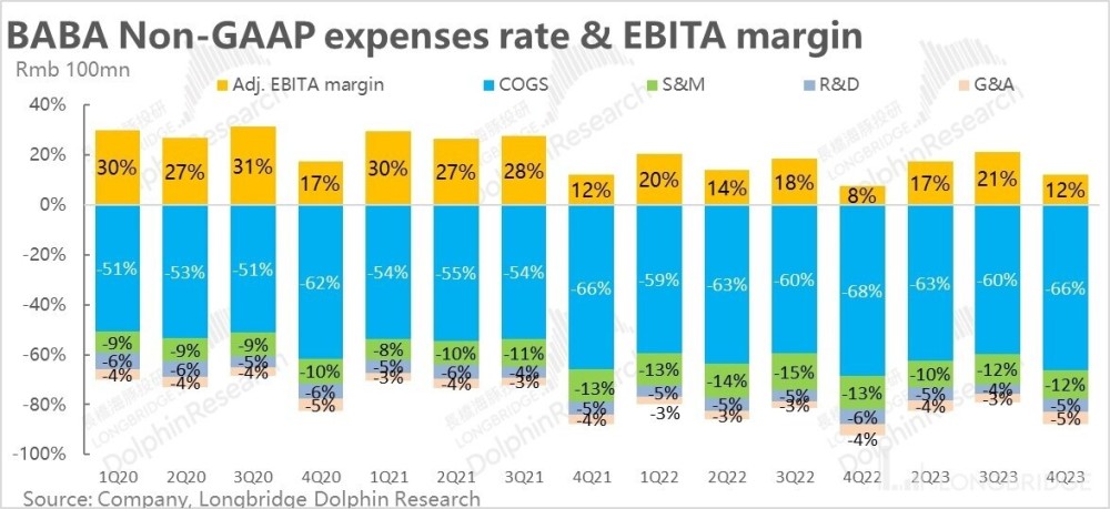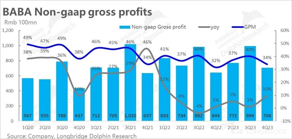 各亏损业务线目标一起看向自负盈亏,各板块努力降本提效的背景下,本季季度阿里整体实现了毛利 706 亿,毛利率从 32% 同比提升到了 34%。虽然看似提升幅度不大,但在总营收几乎零增长的背景下,总毛利却增长了 10%,增速连续改善。实现即便不增收,也能继续增利。