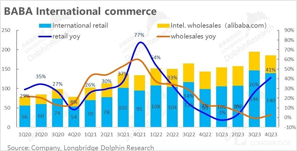 而本次财报显示,阿里国际商务零售业务的营收同比增速大幅提速到 41%,营收规模也达到 140 亿。其中 Lazada 平台的订单数增长达双位数,包括速卖通、Trendyol 等整体订单增长也达到了 15%。可见在蒋凡带队国际板块对立运营后,增长战斗力明显回升。