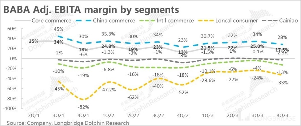 利润层面,核心商务(包括上述板块)在剔除股权激励、摊销费用影响后的利润(调整后 EBITA)接近 317 亿,远超去年同期 232 亿和市场预期的约 260 亿,利润率也同比从 13% 显著提升到了 17.5%。虽然营收增长的确还比较难看,但降本增效和利润释放还在过程当中。