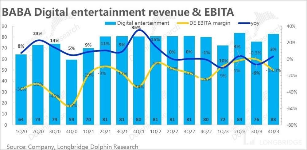 随着国内居民开始回归影院,本季度阿里文娱板块的营收同比增长了 3% 到 83 亿。同时在季节性利润低点的文娱板块虽然 EBITA 亏损率仍有 13%,但实际同比来看已改善了超 10pct。同样随着国内居民出门活动、玩乐继续修复,阿里文娱板块大概率也是能继续改善的。