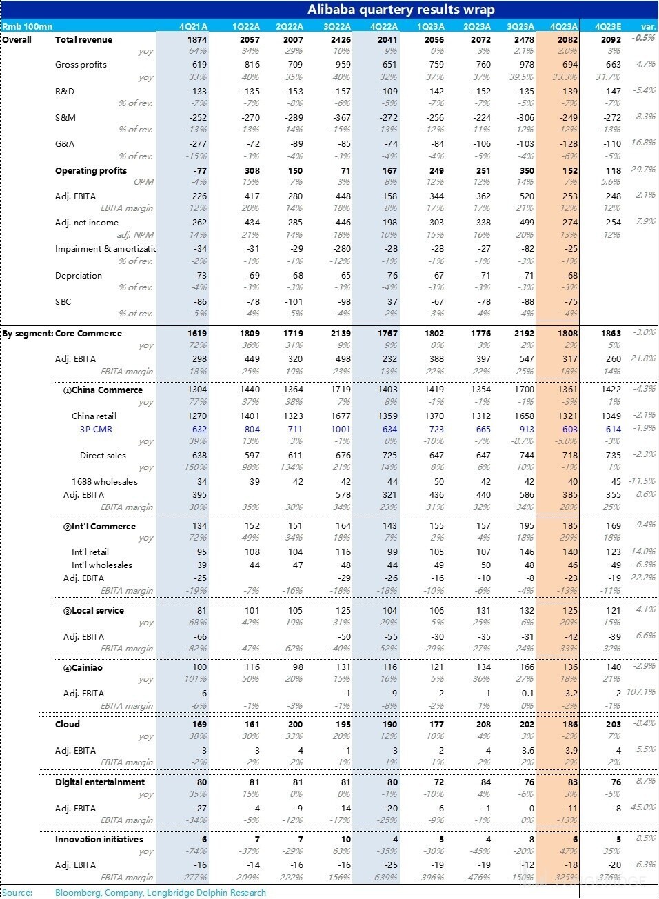 因此,虽然老大哥淘天平台增长尚未见起色,但在所有板块的共同努力下,市场最为关注的利润指标——调整后 EBITA 利润上达到了 253 亿,较去年同期的 158 亿几乎多了百亿。