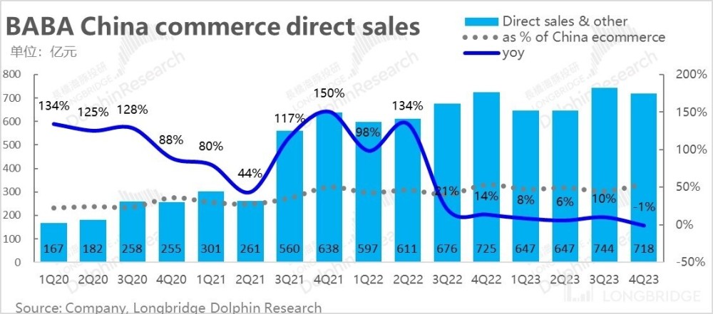 在 Core-core 的淘天业务外,阿里国内的重资产零售业务(包括盒马、高鑫零售、银泰、猫超自营及阿里健康等),本季度收入为 718 亿元,同比也收缩了 1%。虽然业务首次出现负增长,但考虑到去年较高的基数,且放开后居民对生鲜类即时零售的需求不再那么迫切,本季表现虽差但市场大体也有预期。