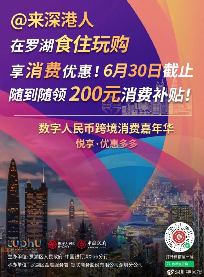 @ 来深香港居民,2月份罗湖启动的“湾区启新·再遇罗湖”数字人民币跨境消费嘉年华活动中的“悦享·优惠多多”活动将延期至6月30日!还未申领数字人民币硬钱包或申领了硬钱包还未消费的港人们,速速回罗湖消费啦。详情>>>
