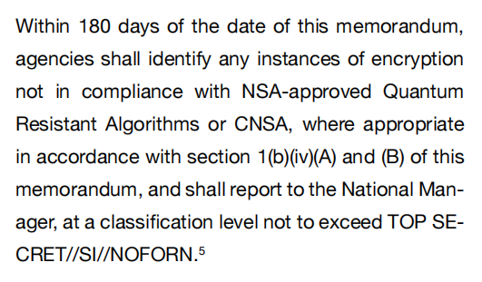 2022年1月,白宫通过发布NSM-8承认了量子威胁存在的现实,这是白宫国家安全机构在当前联邦网络安全规划的背景下,首次明确提到抗量子密码学。该文件特别指示国家安全局向处理机密或敏感信息的管理机构的首席信息官发布与“抗量子协议以及在必要时使用抗量子密码学的规划”有关的任何文件。