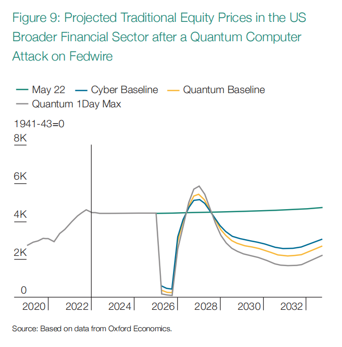 初步研究表明,未来的量子攻击将比可比的传统计算机黑客攻击严重得多,因为它将是不可检测的(所有交易或邪恶的行为者的访问将看起来是真实的),因此可以持续几天或几周。事实上,由于银行挤兑和内生的流动性陷阱,量子计算机攻击可以损害银行系统中近60%的总资产。
