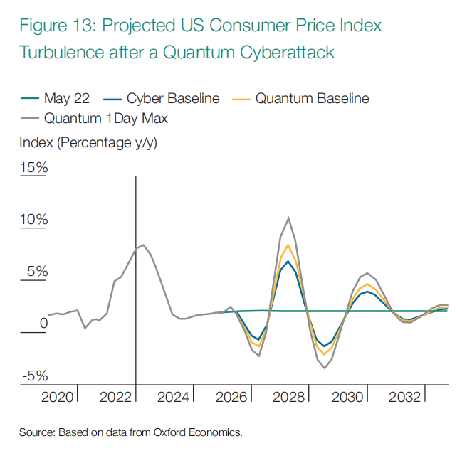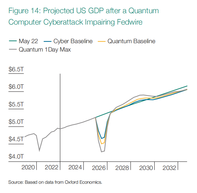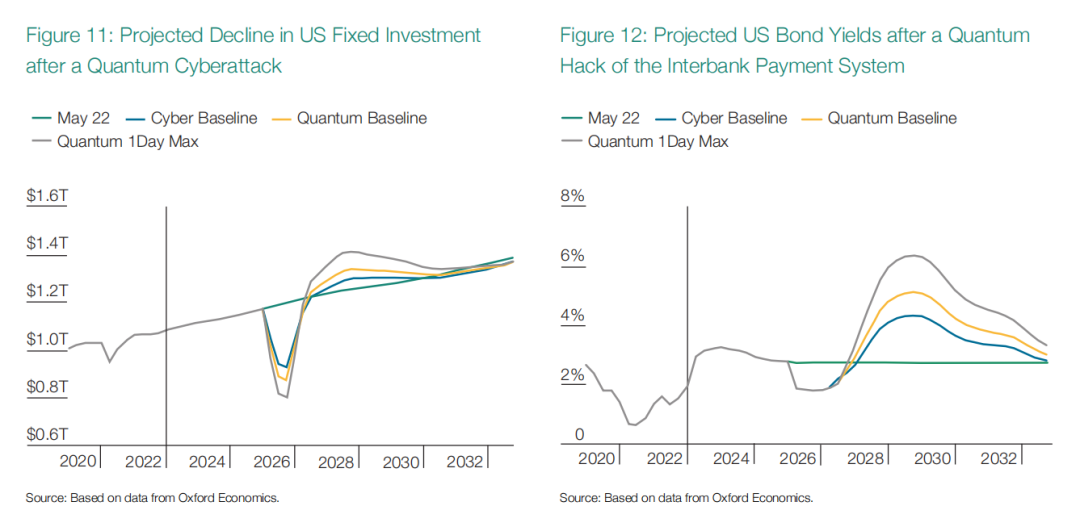 分析发现,一个量子黑客及其对整个金融业的连带影响将导致每年的实际GDP下降,从基线情况下的10%到最大影响攻击情况下的17%。最终,这样的事件将蔓延到整个美国经济,并将国家推入为期六个月的经济衰退。