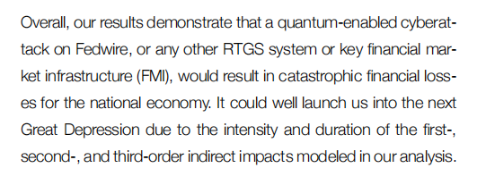 “总的来说,我们的结果表明,Fedwire或任何其他RTGS系统或关键FMI的量子化受损,将导致国家经济的灾难性金融损失。由于流动性黑洞和国家关键基础设施(我们的银行间支付系统Fedwire Funds Service)安全不足所产生的一阶、二阶和三阶间接影响的强度和持续时间,它可能使我们陷入下一次大萧条。”