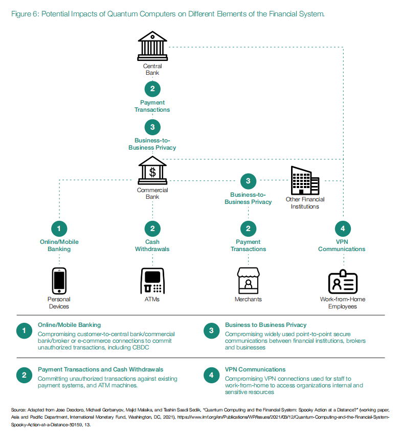 一旦量子计算机秘密地进入网络,任何数量的病毒或类型的攻击都可以渗入并以不可估量的速度在我们的财政部门蔓延。从简单的数据泄露或停止一家银行的交易,到通过SWIFT网络破坏证券交易所和改变隔夜贷款利率的欺诈性交易;攻击可能有多种形式:所有这些攻击者都将使他们的渗透不被发现、并阻碍响应和恢复。