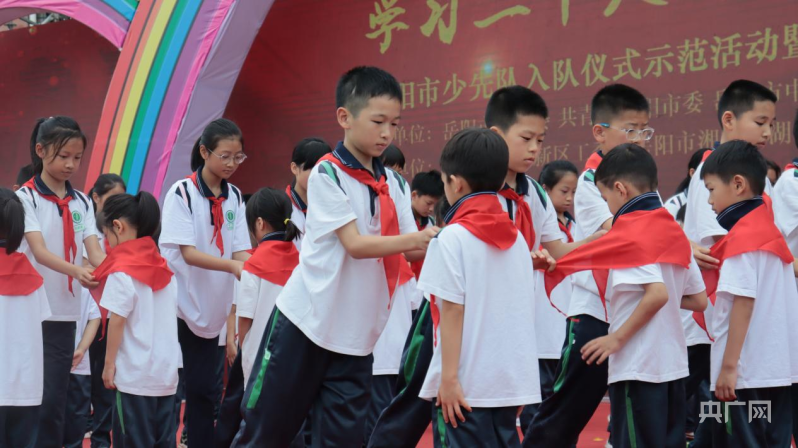 优秀少先队员代表为新队员佩戴鲜艳的红领巾(央广网发 张菲 摄)