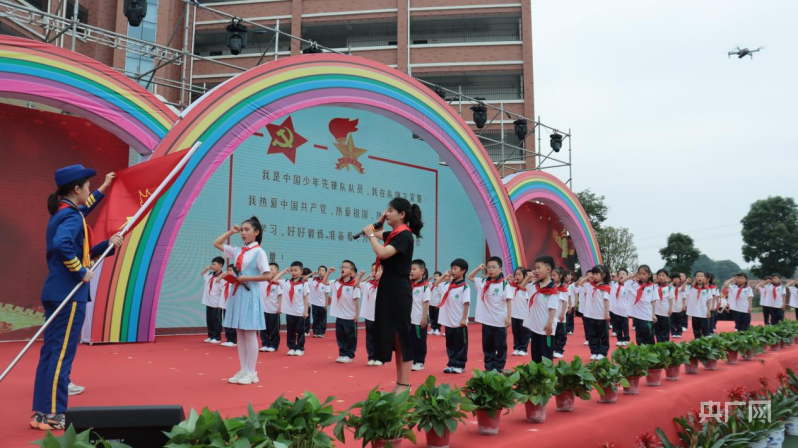 火红的队旗下,全体少先队员郑重宣誓(央广网发 王紫怡 摄)