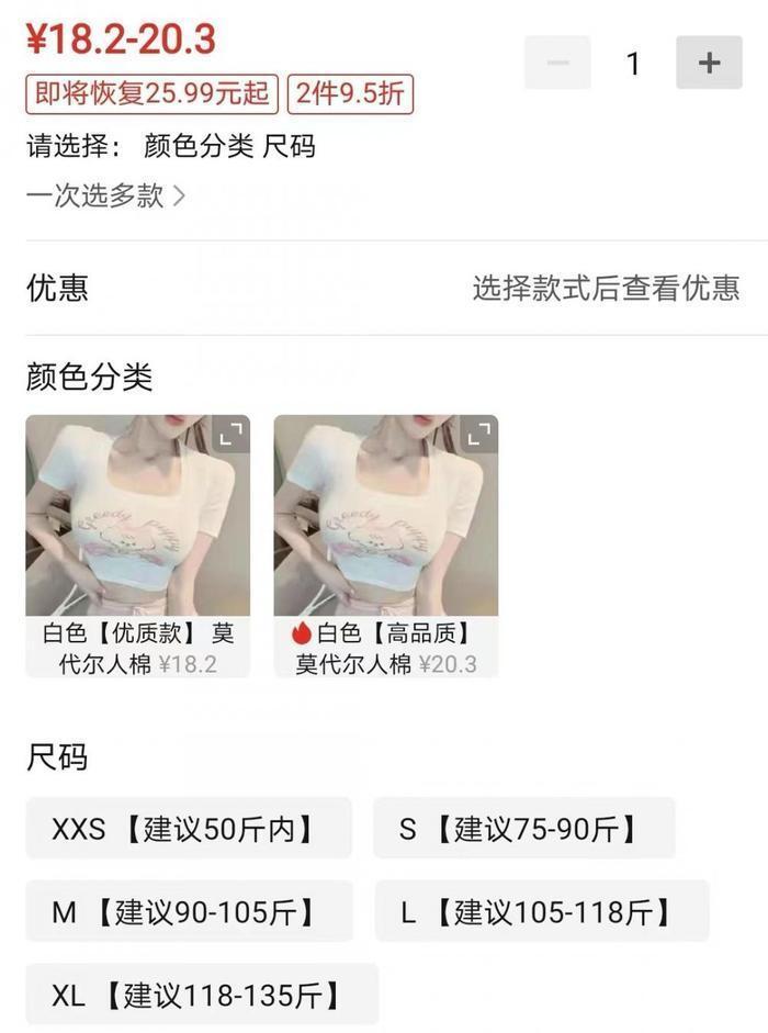 记者在一些网购平台发现,一些商家自行设定尺码,成人女装甚至出现“XXS 20斤内”“XS 30斤内”“XXS建议50斤内”字样。