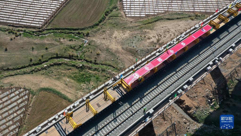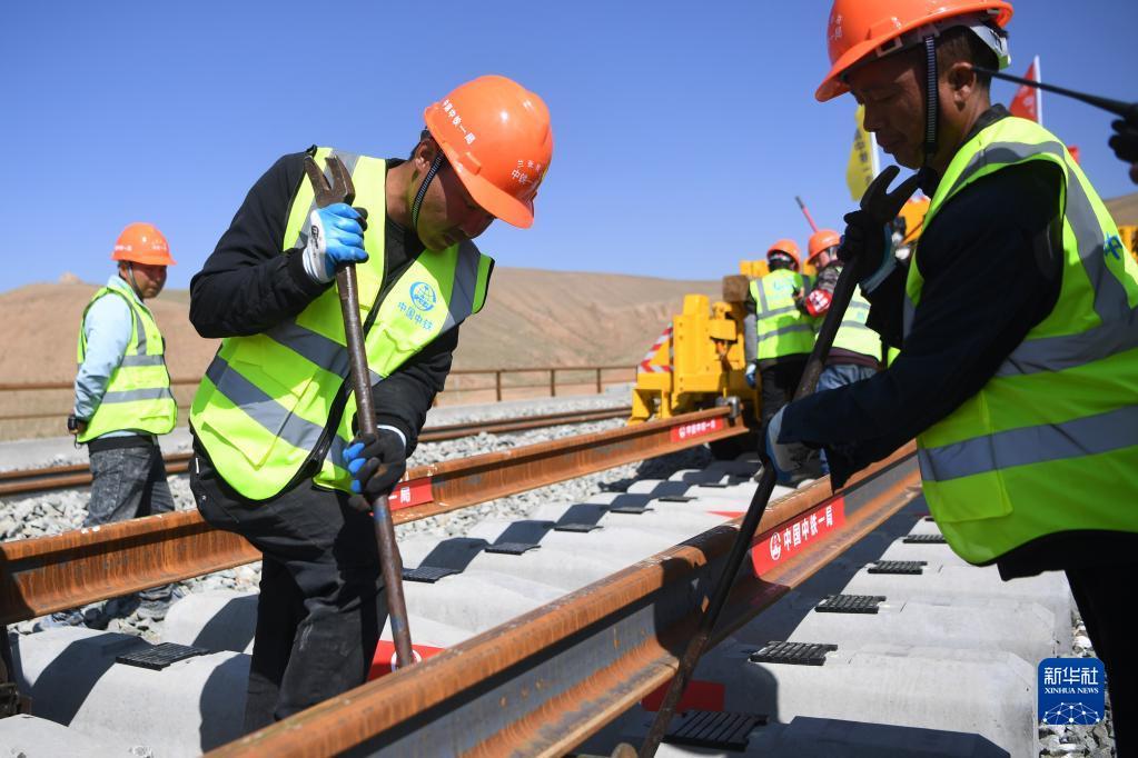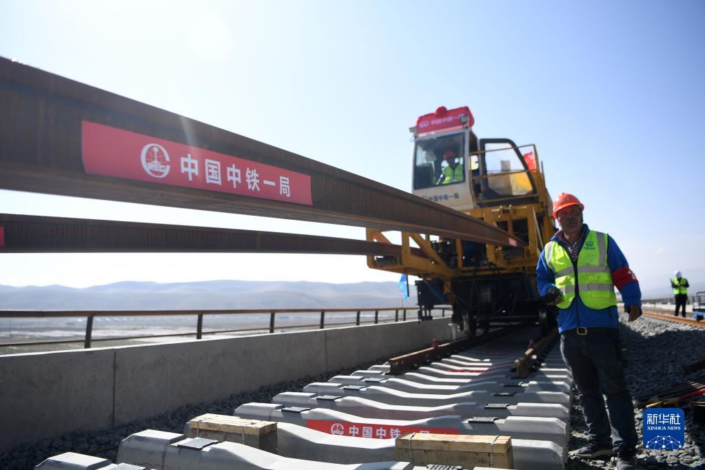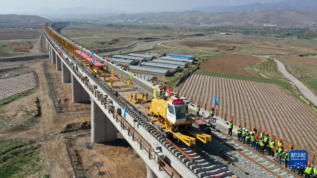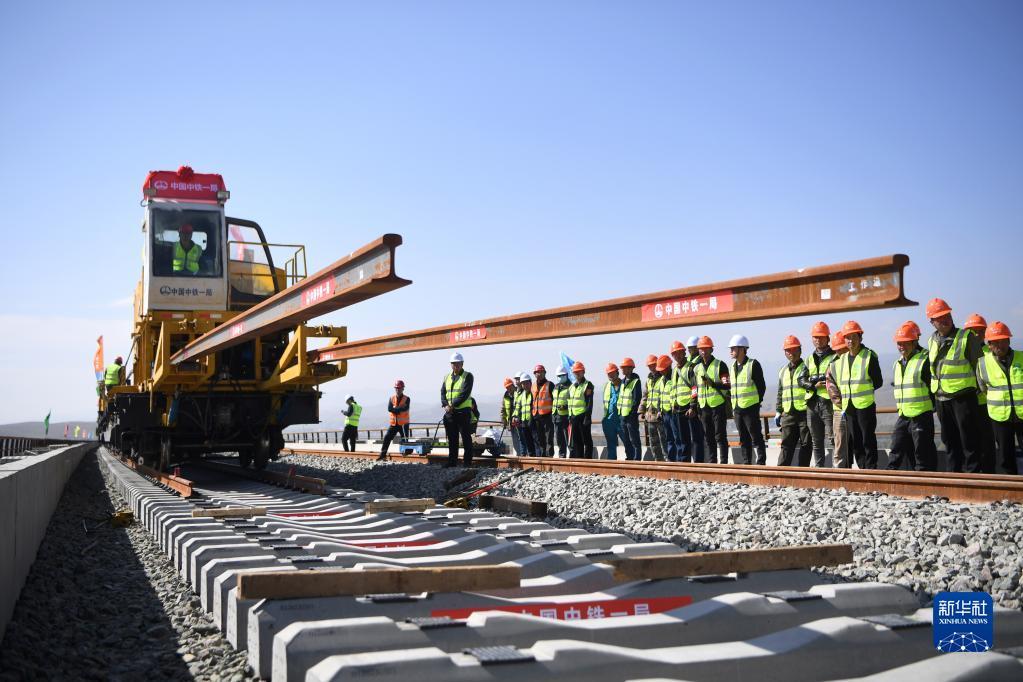 当日,在甘肃省武威市天祝藏族自治县境内兰(兰州)张(张掖)三四线铁路铺轨施工现场,一体式牵引车在中铁一局施工人员的操作下,将一组500米长的钢轨精准铺设在道床上,标志着由中铁一局承建的兰张三四线铁路兰州至武威段进入全线铺轨阶段。