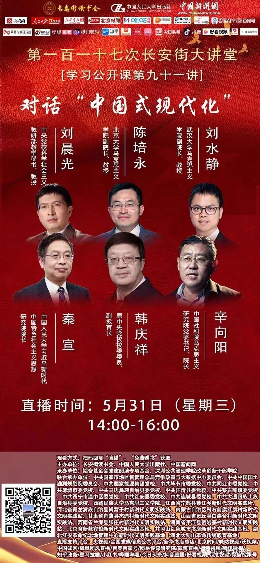 2023年5月31日下午14:00,长安街读书会、中国人民大学出版社携手嘉宾为您带来“第一百一十七次长安街大讲堂:对话“中国式现代化”。