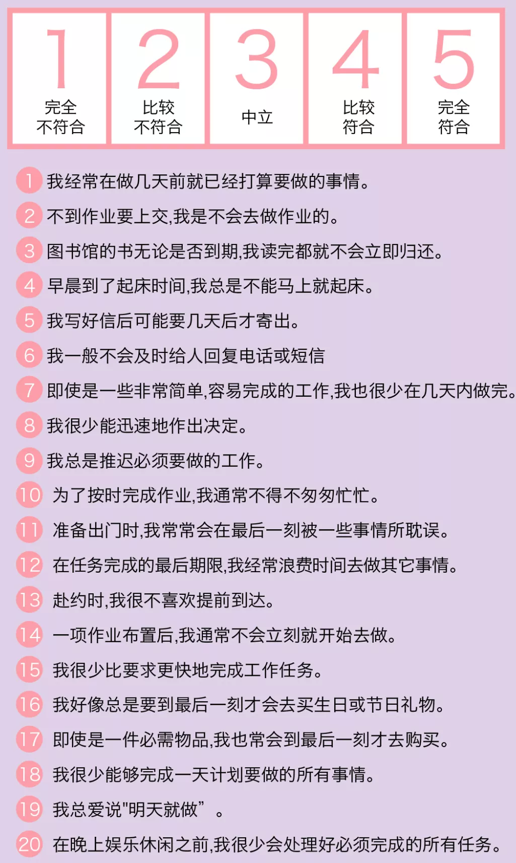 不管你自己觉得是“重度拖延者”还是”间歇性拖延”,甚至是“建设性拖延”或“战略性拖延”,来,做一下这张【一般拖延量表】,看看自己能得多少分。PS:针对下面的20个问题,请用1-5分别对每一个陈述和自己相符合的程度打分。做完之后,请将每道题的得分加起来。