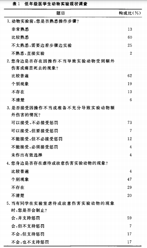 针对实验人员对动物实验伦理的认知态度,有研究小组在2018年对374名大一、大二的临床医学专业学生进行了问卷调查,旨在了解低年级医学生对动物实验伦理的认知情况。调查显示,在低年级医学生的动物实验中,普遍存在准备不充分、操作不当、放任动物受到伤害的现象。 62%的同学认为“实验动物受到额外伤害或者痛苦死去”的现象较为普遍,53%的同学认为“虐待动物、故意伤害动物”不是个别现象,73%的同学可以接受对实验动物的额外伤害并不必接受惩罚。[1] 结果表明,低年级医学生的动物实验操作普遍存在伦理失范现象,低年级学生尚未形成对实验动物的科学理性态度,学校的动物实验伦理教育有待加强。