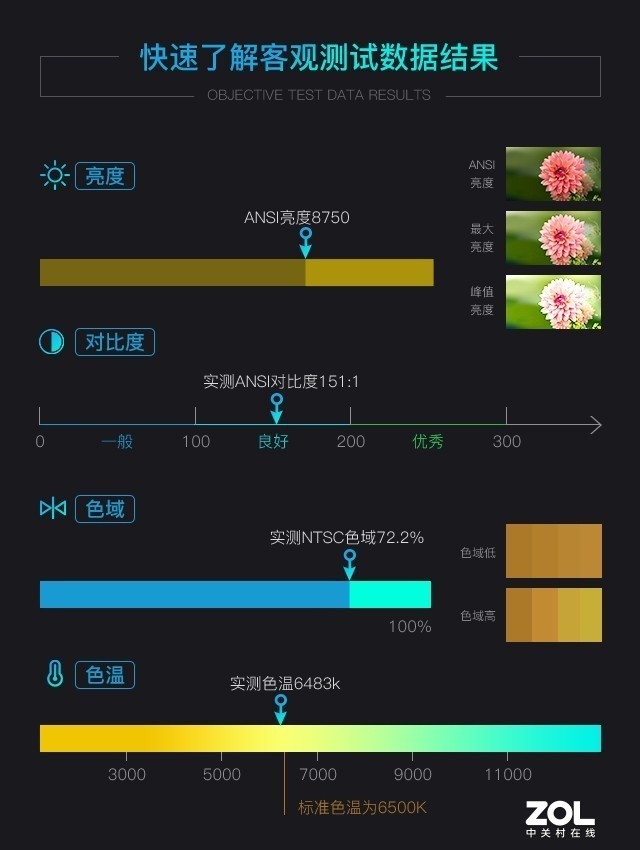 实测数据显示,松下PT-SMZ88CL工程投影机的ANSI亮度达到了8750 ANSI流明,超过了标称值,这个数据也可以确保在博物馆、主题乐园等领域的应用需求;实测NTSC色域为72.2%,能够呈现更为丰富的颜色;色温为6483K,接近标准值,不会出现颜色漂移。