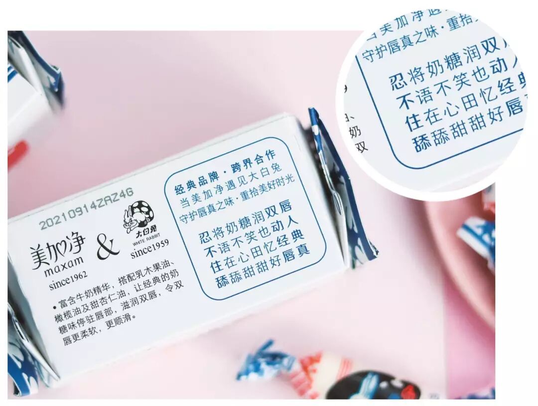 而这回,两个国民品牌:大白兔奶糖和美加净也搞了把大事,联名推出了这款大白兔奶糖润唇膏。