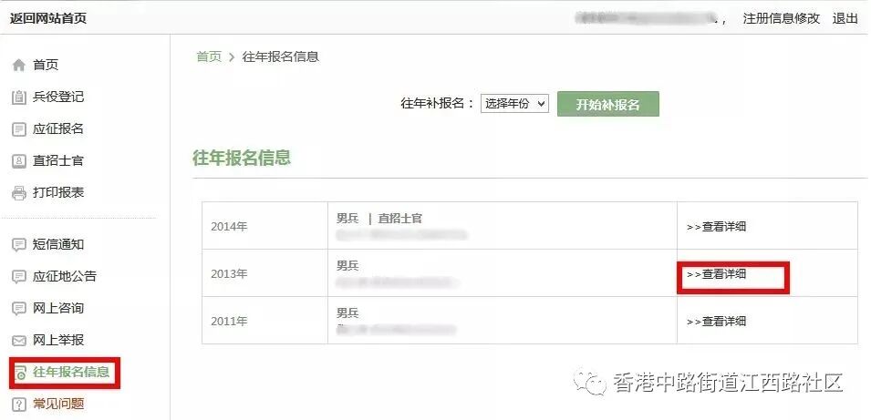 登录征兵系统,点击左侧的“往年报名信息”菜单,在右侧的“往年报名信息”列表中,点击相应报名年份后的“查看详细”链接。