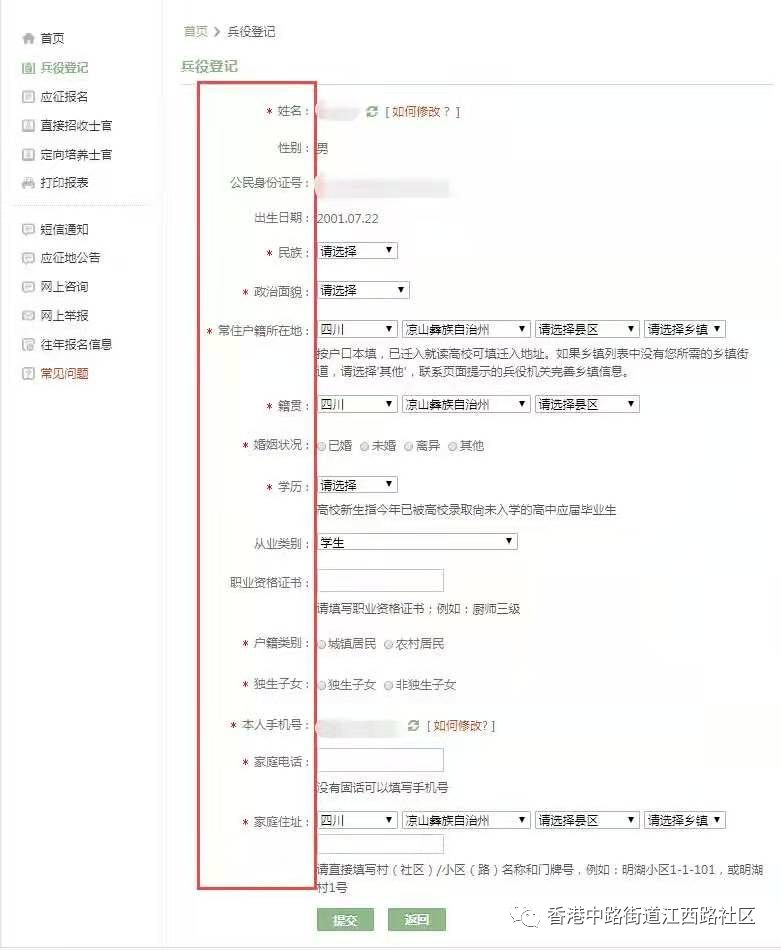 进入兵役登记页面后,首先点击“开始兵役登记”,填写框内带*的全部内容,之后点击“提交”。
