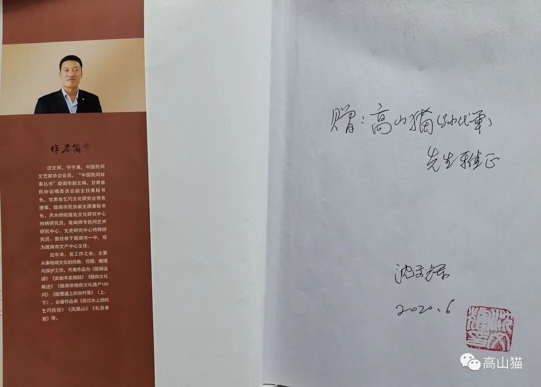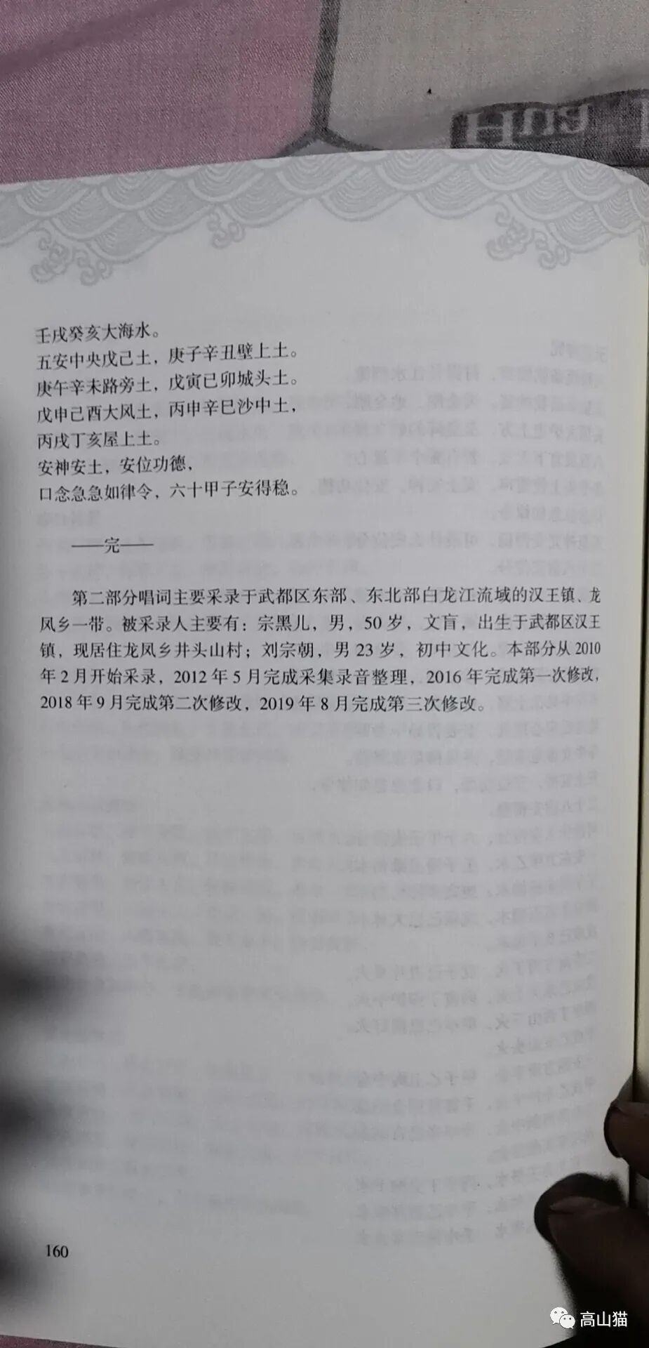 除上述神话故事外,《陇南羊皮扇鼓》书中还有二郎神以及太上老君的神话故事内容。尤其是陈光蕊和江流儿的神话故事,内容叙述完整,语句章法明快,读起来琅琅上口,堪称是全书精华内容。更令读者期待的是《陇南羊皮扇鼓》第二卷即将出版,我在参与校对第二卷书稿过程中,还发现有牡丹香等神话故事更是富有较高的民俗研究价值。以上本人只是从神话故事的角度来帮读者解读书中的内容,这些资料是在网上搜索不到的,希望能够给热衷于陇南民间非遗文化研究的学者和同学们提供参考借鉴,同时非常感谢沈文辉老师对我的信任,说的不妥之处,希望大家批评指正,需要图书的朋友请加我微信gaoshanmao520咨询。