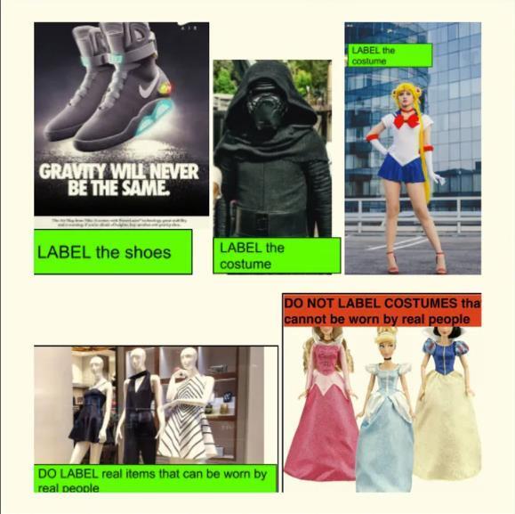 除此之外,还有关于任务的指示说明,比如必须给真实的、可以供人类穿着或打算供真人穿着的物品贴标签。齐耶扎对自己区分真人可以穿的真衣服和不能穿的假衣服的能力充满信心,于是他开始了测试。然而,他马上遭到了当头一击:电脑给出一张杂志图片,上面是一位穿着裙子的女性照片。衣服的照片应该被视为真正的衣服吗?不,齐耶扎想,因为人不能穿衣服的照片。结果显示错误!因为在人工智能看来,真衣服的照片就相当于真衣服。