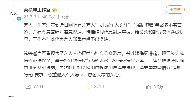 同日11时许,蔡徐坤在其个人微博回应“强制女生堕胎”一事,称其和C女士的交往均属双方自愿,既不存在“女方为未成年”的情况,也不存在所谓的“强制堕胎”,不涉及违法行为。恳请相关自媒体不传谣、不信谣。
