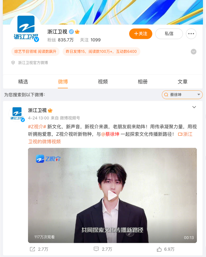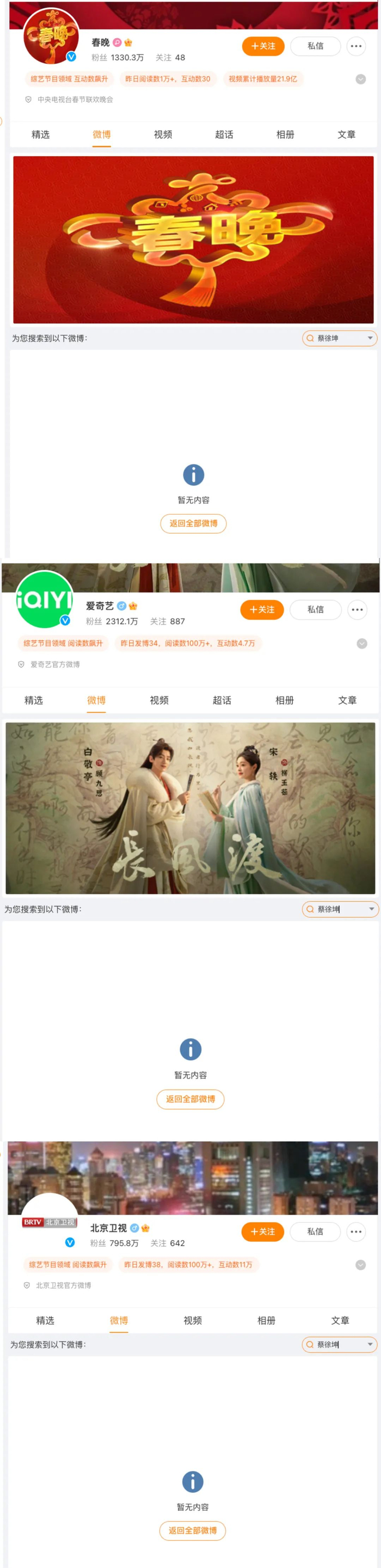 7月3日,网友称除央视网、央视新闻等微博官号主页搜索蔡徐坤相关内容都被清空外,春晚官方微博、爱奇艺官博、北京卫视微博也无蔡徐坤相关内容,浙江卫视只剩1条博文。而此前,蔡徐坤都曾参与这些平台的多个综艺、晚会和活动。
