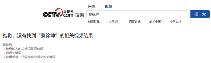 在央视网输入蔡徐坤,也显示:抱歉,没有找到“蔡徐坤”的相关视频结果。