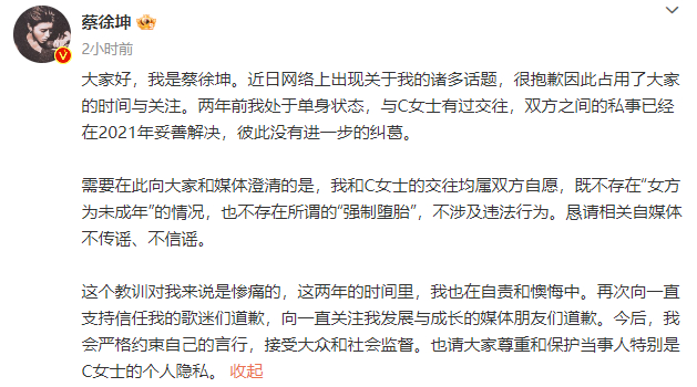 日前,歌手蔡徐坤被爆料因与一女子发生一夜情导致其怀孕并让其打胎,此事引发网友关注。时隔多日,蔡徐坤才于今(3)日发了一则回应:与C女士有过交往,不存在涉未成年人和强制堕胎。