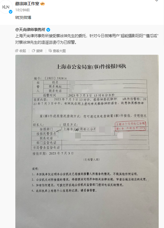 而在该博主报警后,蔡徐坤工作室转发了律师事务所的微博称:针对今日微博用户“超能摄影阳阳”“懂瓜呱”对蔡徐坤先生的造谣诽谤行为已报警。