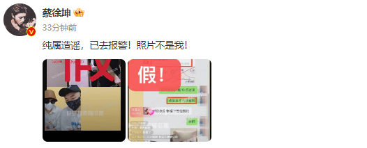 在蔡徐坤发文回应后,又有狗仔在直播间曝光蔡徐坤有另一位情人W小姐。蔡徐坤此次立马做出回应:“纯属造谣,已去报警!照片不是我!”