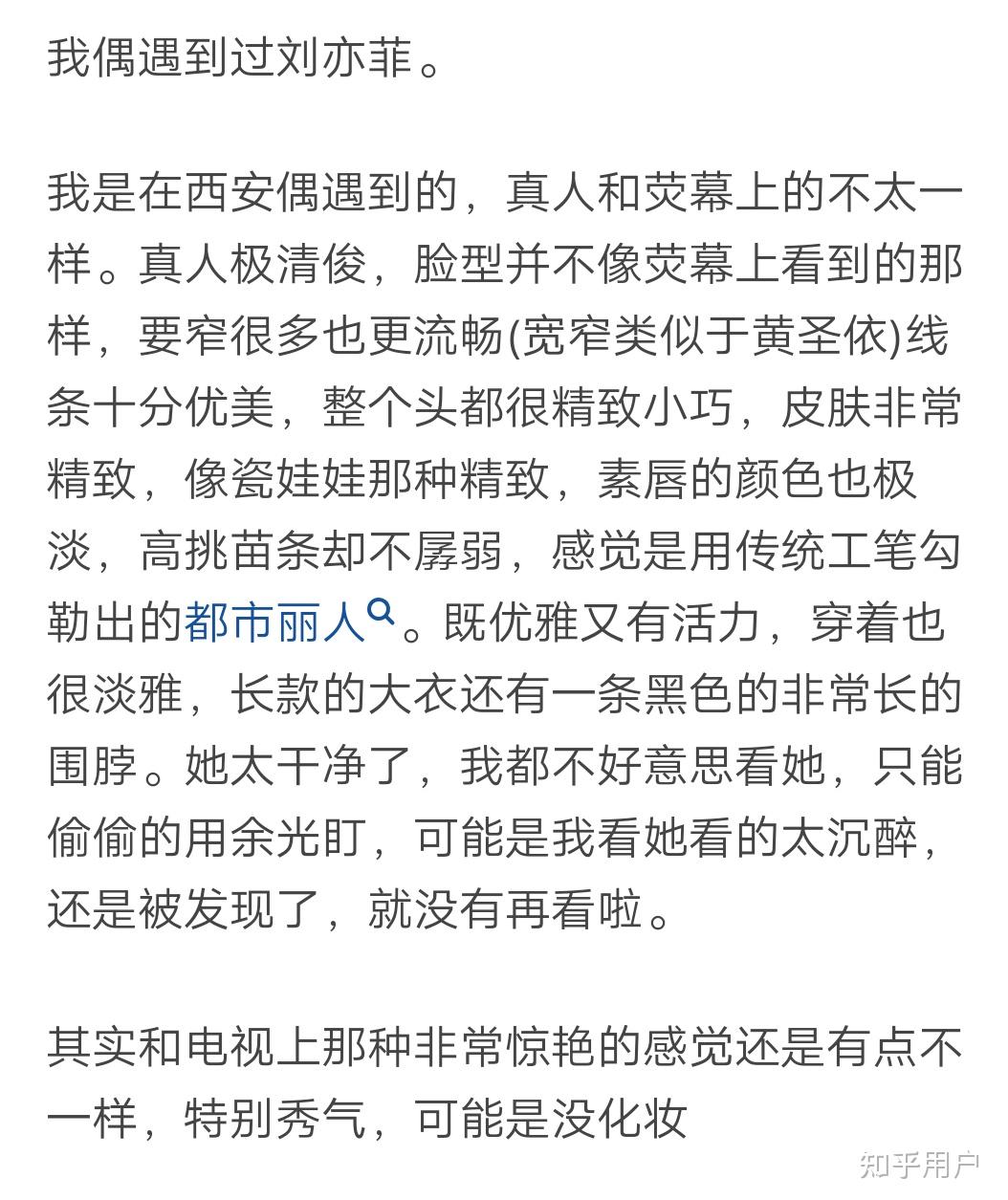 见到刘亦菲本人之前,她在我心目中是完美的代名词。但那次意外的相遇后,说实话,反而觉得她也就一比较漂亮的普通人而已。不过这样也好,反而放下了很多。
