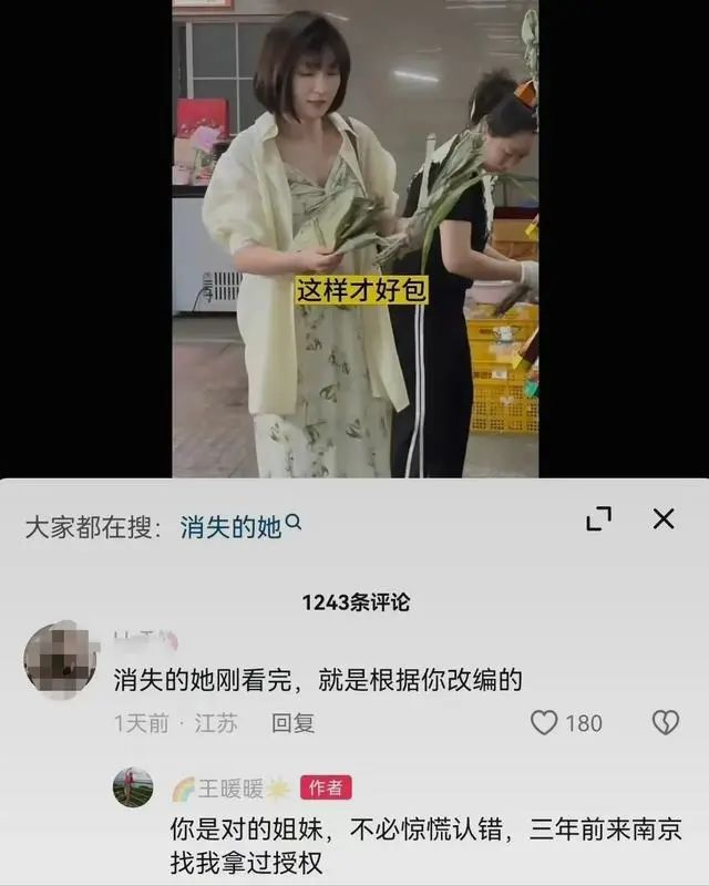 有网友在王暖暖的短视频账号下留言,表示自己看完电影《消失的她》,认为是根据其真实故事改编。对此王暖暖予以确认,并表示“三年前来南京找我拿过授权”。