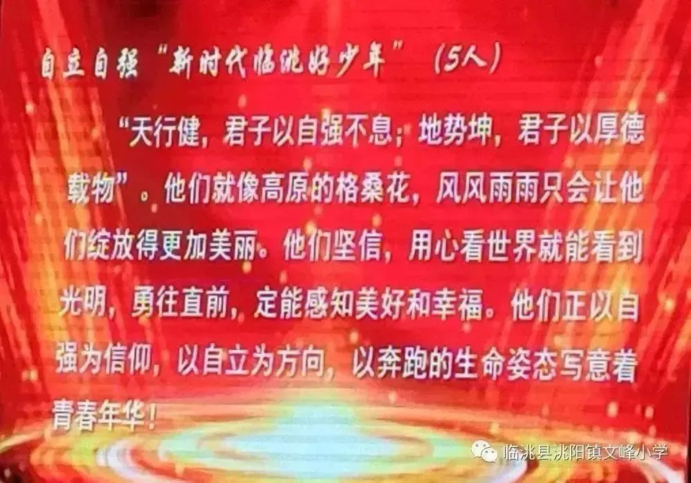 为进一步加强未成年人思想道德建设,树立一批事迹突出的模范典型,引导广大未成年人见贤思齐、向上向善,培养和造就担当民族复兴大任的时代新人,县委宣传部、县教育局、团县委、县妇联、县融媒体中心、县关工委等部门在全县组织开展了2023 年度“新时代临洮好少年”选树宣传活动。经宣传发动、公开推选、组织评审、网络公示,临洮县洮阳镇文峰小学六年级1班孙文童同学被评为2023年度“新时代临洮好少年”荣誉称号。