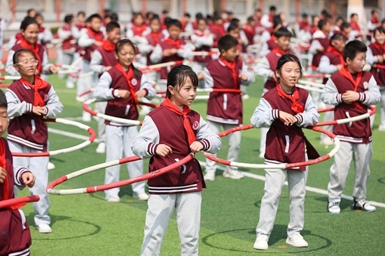 4月27日,江苏省连云港市,罗阳中心小学学生在大课间练习呼啦圈。视觉中国供图(资料图片)