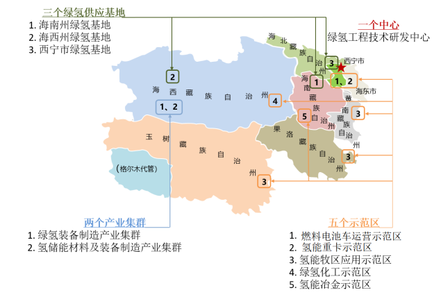 推动“五个示范区”。有序分批开展配套氢储运、加氢站、氢能车等产业示范,在西宁经济技术开发区、海东工业园区、零碳产业园建设氢燃料电池车运营示范区;在西宁市、海东市的物流园区和矿区等建设氢能重卡示范区;在海西州建设绿氢化工示范区;在海东市、海西州建设氢能冶金示范区;在玉树、果洛、黄南自治州建设氢能牧区应用示范区。