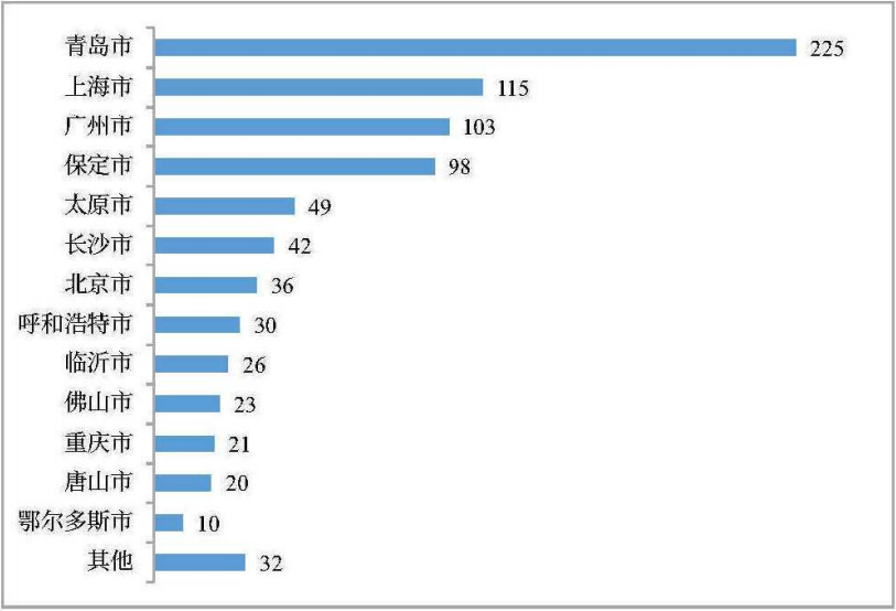 图4 2021年我国燃料电池专用车销售重点城市分布(辆)