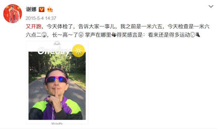 如果没记错的话,按微博上谢娜说的,她34岁了,通过运动长高了一厘米多。
