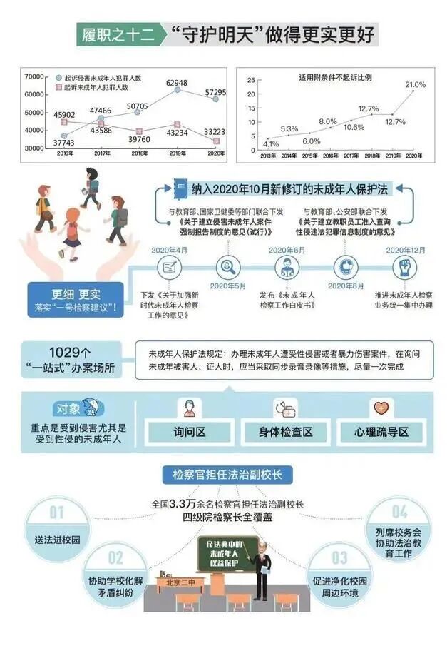 从严追诉性侵、虐待未成年人和拐卖儿童等犯罪5.7万人。会同有关部门建成1029个“一站式”办案场所,促进询问、证据提取一次完成,尽力防止“二次伤害”。对监护人侵害和监护缺失,支持起诉、建议撤销监护人资格513件,是2019年的6.3倍。未成年人涉嫌犯罪既应依法惩戒,更要教育帮扶,重在转化。起诉涉嫌犯罪的未成年人3.3万人。对罪行较轻并有悔改表现的附条件不起诉1.1万人,占办结未成年人案件总数的21%,同比增加8.3个百分点。
