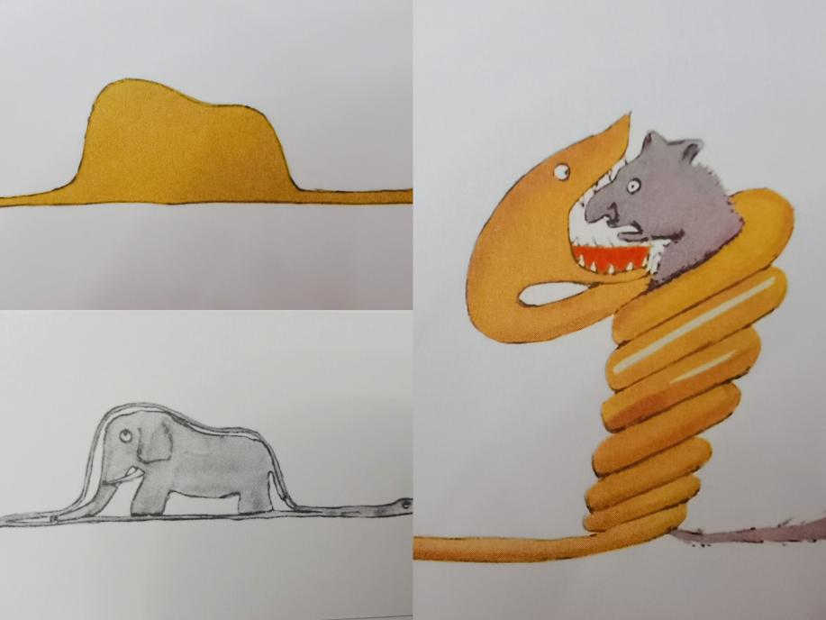 《小王子》的故事从哪里开始呢?首先从作者的自述开始。作者说我小的时候是想要成为一个画家的。你小时候的梦想是什么呢?它有没有实现呢?我给大家读一读。书中说:“在我六岁那年,有一次在一本书里看见一幅很棒的图画,那本书叫《亲身经历的故事》,写的是原始森林在那幅图画上一条大蟒蛇正在吞吃一头野兽,我就把它描了下来,那么大蟒蛇吞吃野兽这个情景是什么样的呢?”大家可以参考配图看看,这个男孩认为就是一条大蟒蛇吃下了一头大象,所以大象在蟒蛇的肚子里。