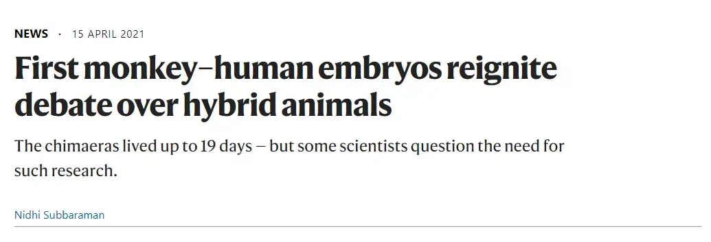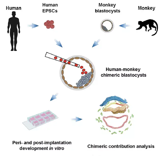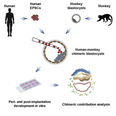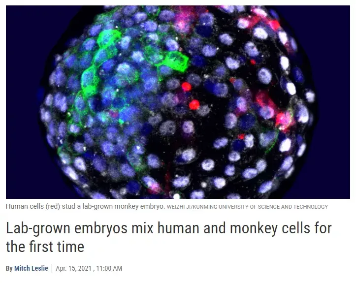 2019 年,由西班牙科学家、美国索尔克生物科学研究所教授 Juan Carlos Izpisua Belmonte 领导的一个跨国研究团队声称,他们已将人类细胞植入猴子胚胎内,成功培育出全球第一个人猴混种胚胎,一度引发巨大争议。