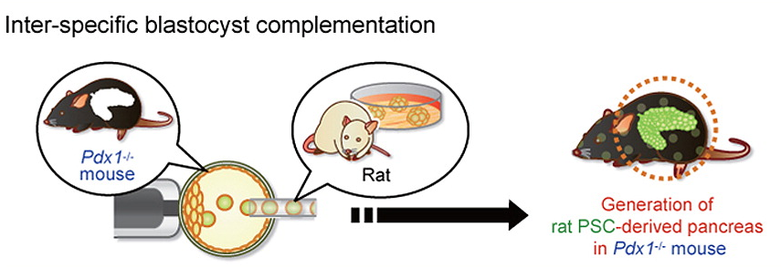具体地说,中内首先通过基因操作的办法敲除掉小鼠的胰脏,然后从这种小鼠体内提取受精卵进行培养,并将大鼠的干细胞注入到其中。接下来,小鼠的受精卵和大鼠的干细胞一起共同发育,彼此互相混合。最后长出一个胰脏完全来自于大鼠细胞的小鼠。